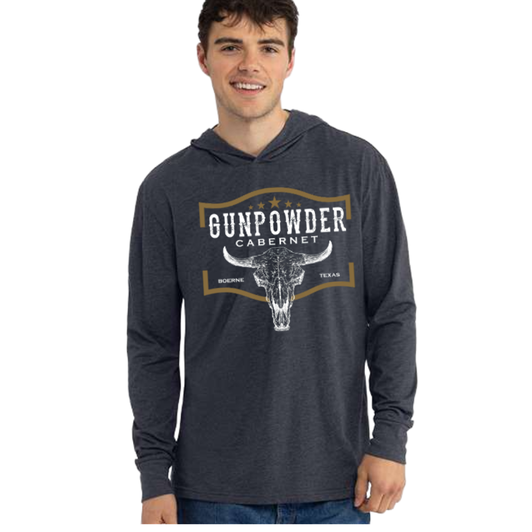 Bold, clean and ready for anything! Our Gunpowder & Cabernet Logo Skull Hoodie Long Sleeve T-Shirt brings street- style to your everyday wardrobe. Crafted in soft, premium cotton-blend fabric, this tee offers comfort and structure in equal measure. The focal point? A signature skull-and-logo graphic that signals you’re not just here to blend in, you’re here to make a statement.